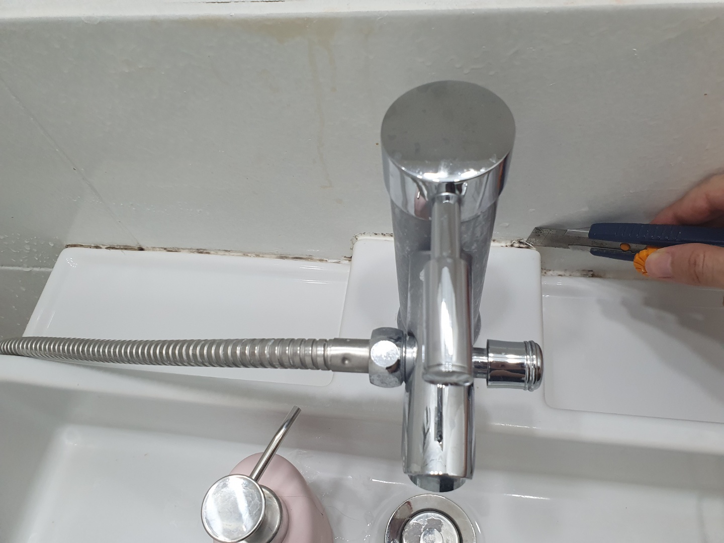 이렇게 곰팡이로 뒤덮였답니다.... 곰팡이를 제거하고 새로 실리콘을 바르기 위해서 커터칼로 열심히 떼고 있는 모습입니다. 지금 생각해보면 차라리 실리콘을 안 쓰고, 깨끗하게 청소했으면 더 좋지 않았을까 생각하네요..
