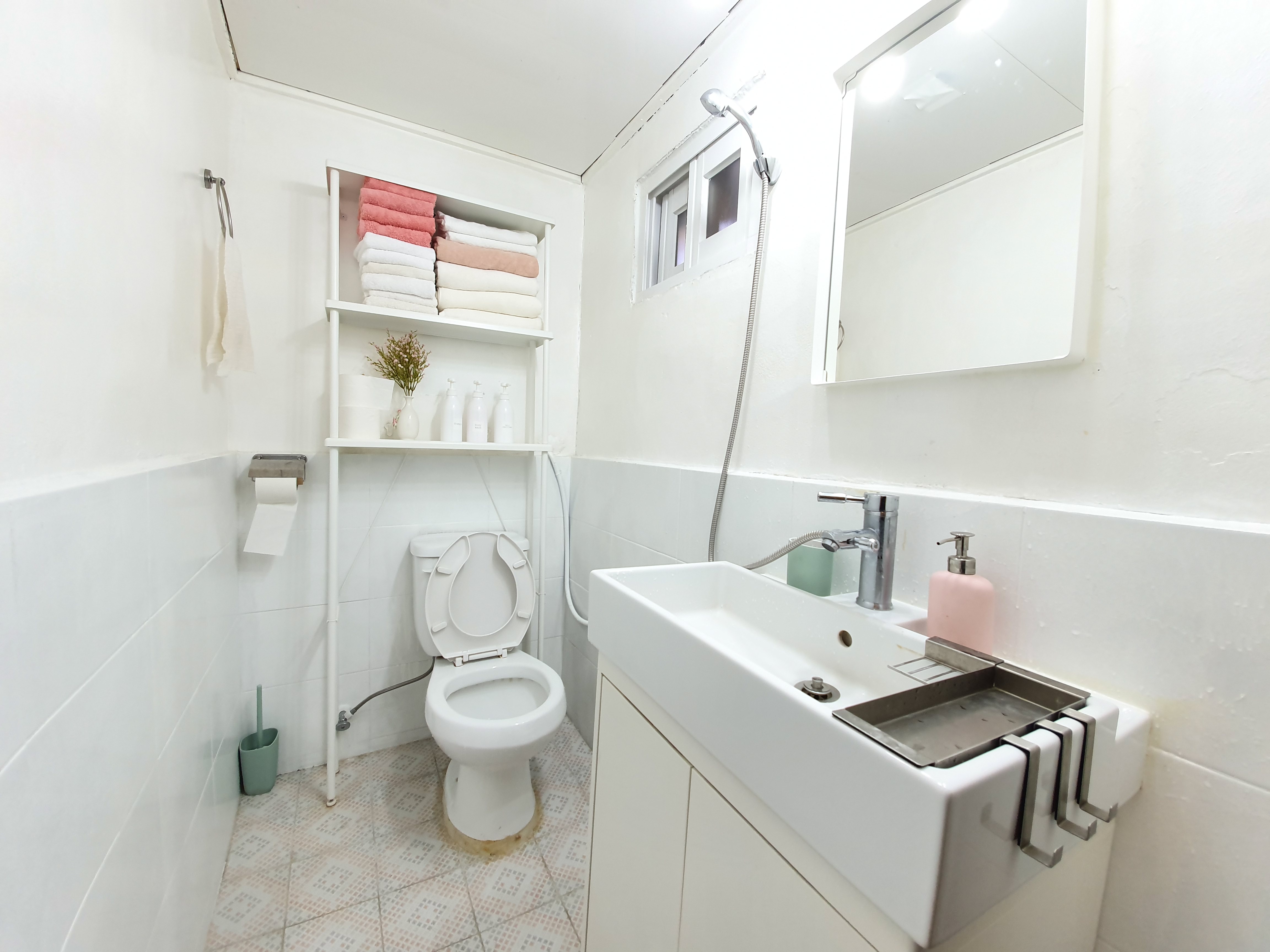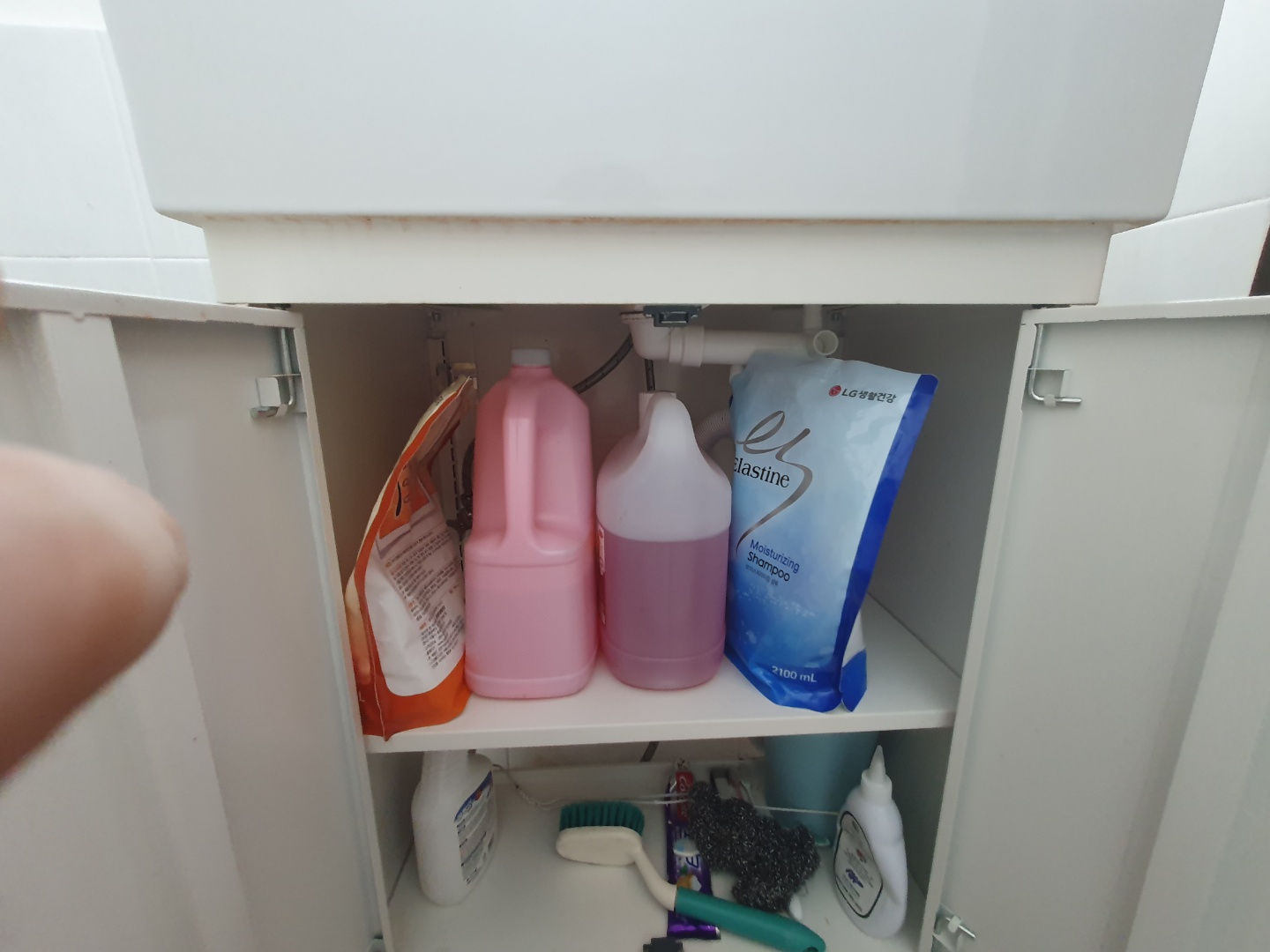 뒤난 세면대의 가장 큰 장점은 이렇게 수납공간이 넉넉한 부분인데요, 다만 배관 부분이 물건에 의해서 조금이라도 밀리게 되면 물이 셀 수 있습니다. 물이 조금씩 세게 되면 곰팡이의 원인이 될 수 있습니다!